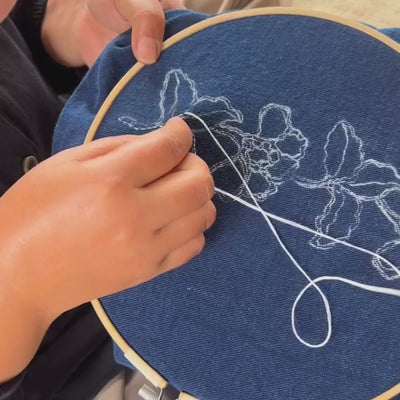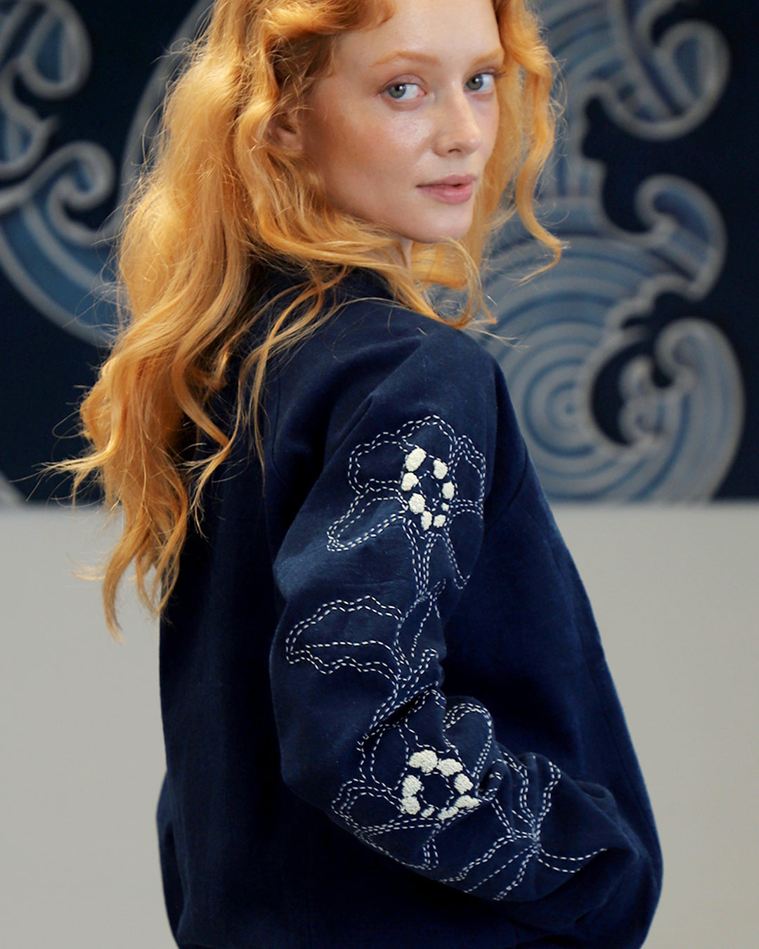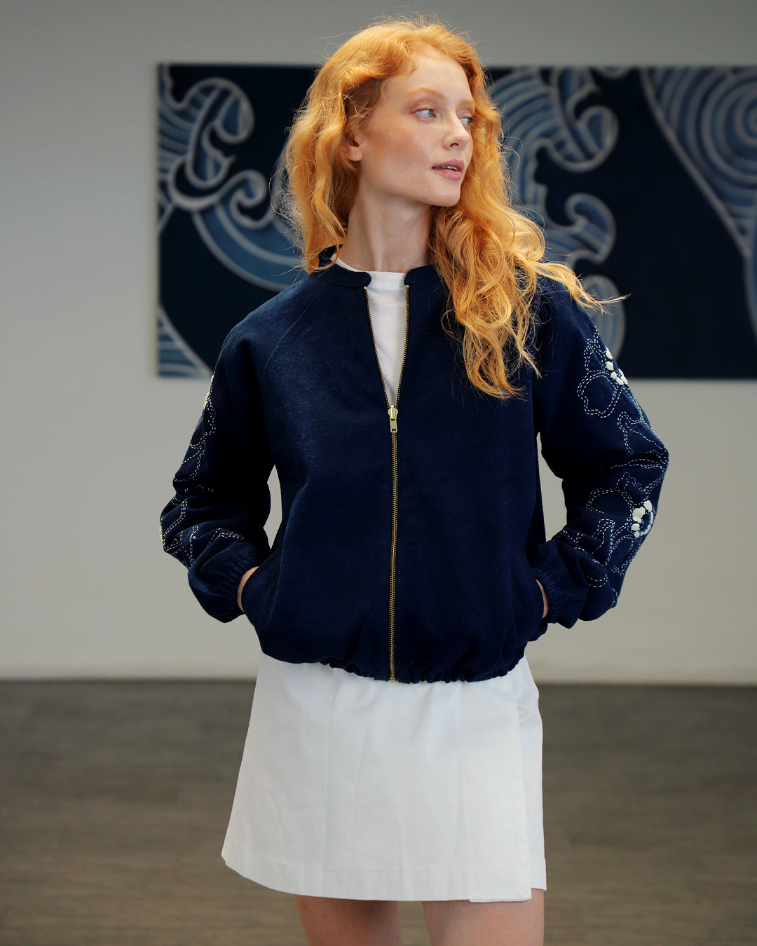 Crafted from hand-dyed indigo denim canvas, this bomber jacket pairs structure with artisanal detail. Choose between a single sashiko-embroidered macro floral or batik-inspired florals stitched by hand on both sleeves, with sashiko and French knots embroidery. Each jacket is a unique expression of craftsmanship.