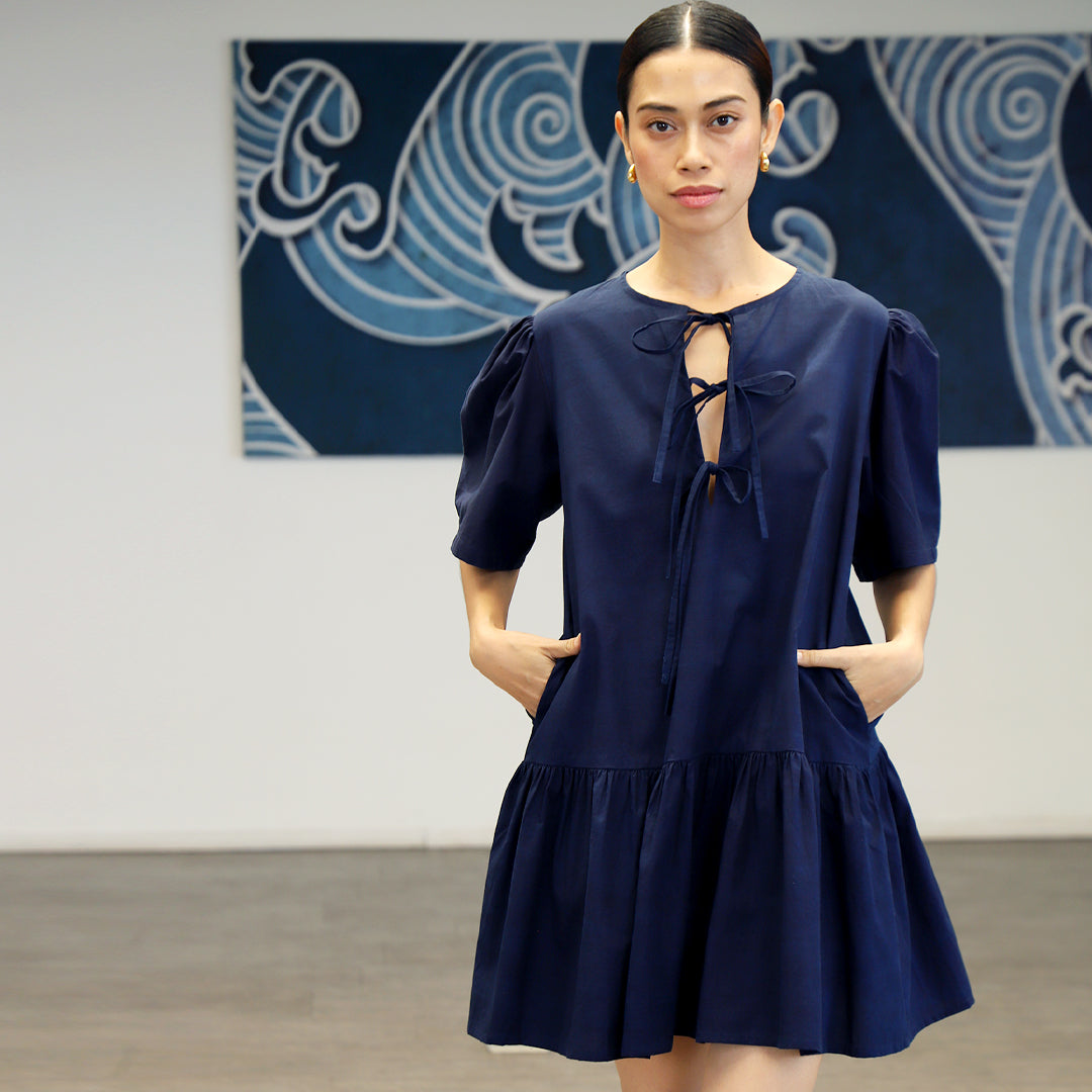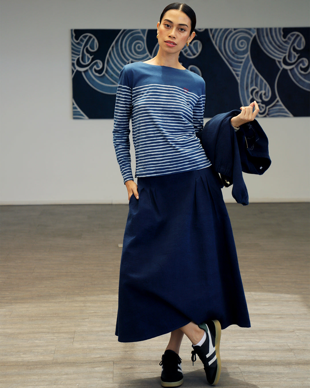 Batik is reimagined for the present—our signature ‘Breton stripe’ batik brush t-shirt pairs effortlessly beneath vintage-inspired shift dresses, bridging young identity with retro charm.