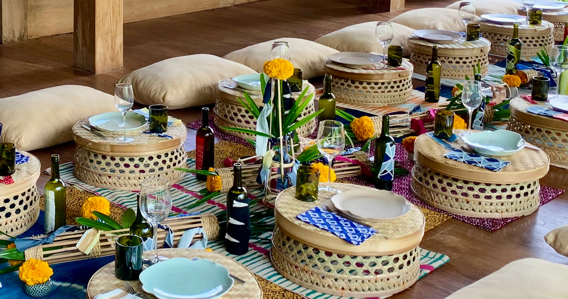Catherine fused Paola’s passion for textiles and nature and envisioned a picnic setting completely created with NAMU Lux scrap fabrics and upcycled Balinese bamboo decor objects, creating a unique and joyful lunch set up.
