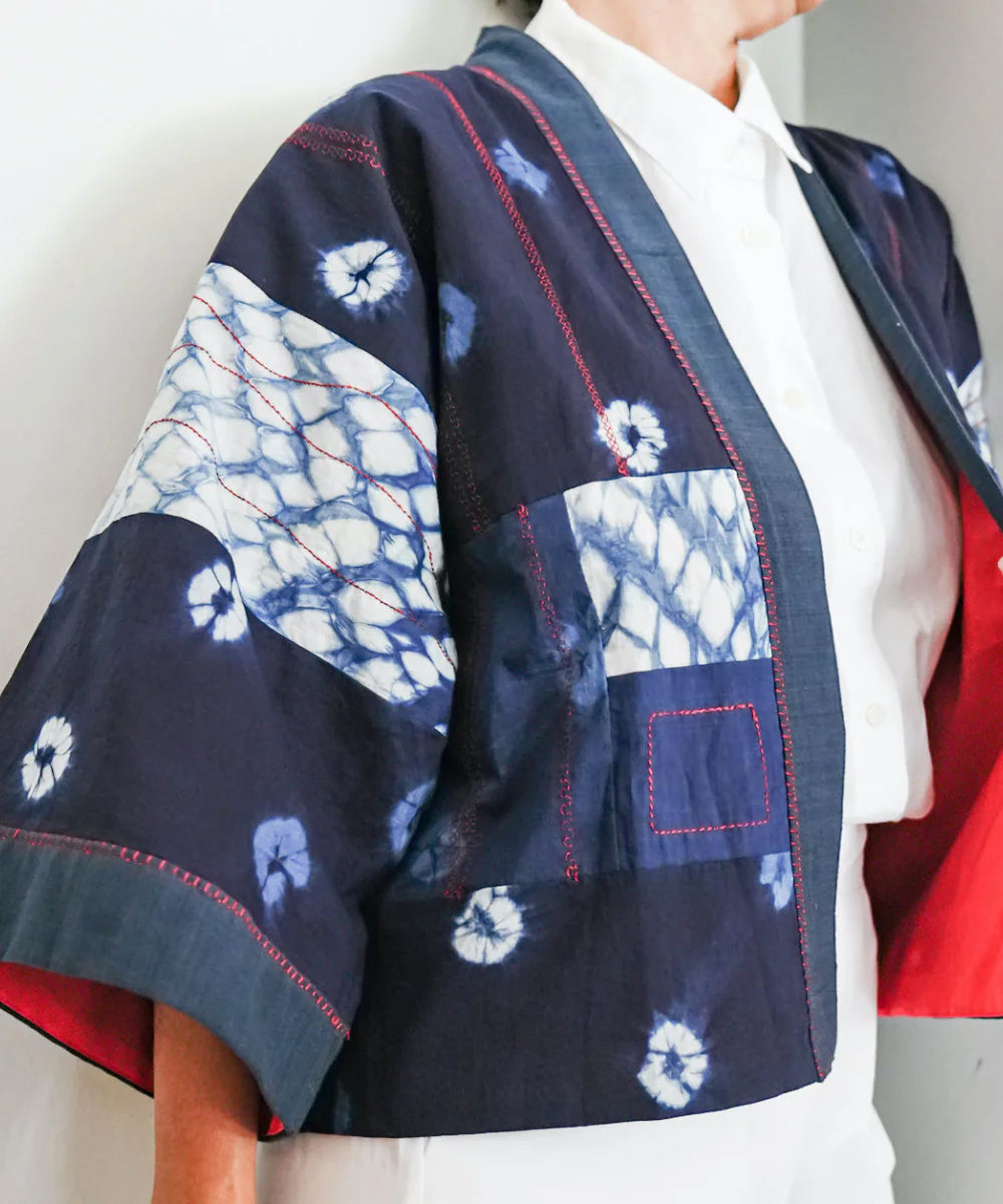 Each kimono is hand-stitched with our left over shibori fabrics and adorned with contrasting red embellishments, making each one a true original.