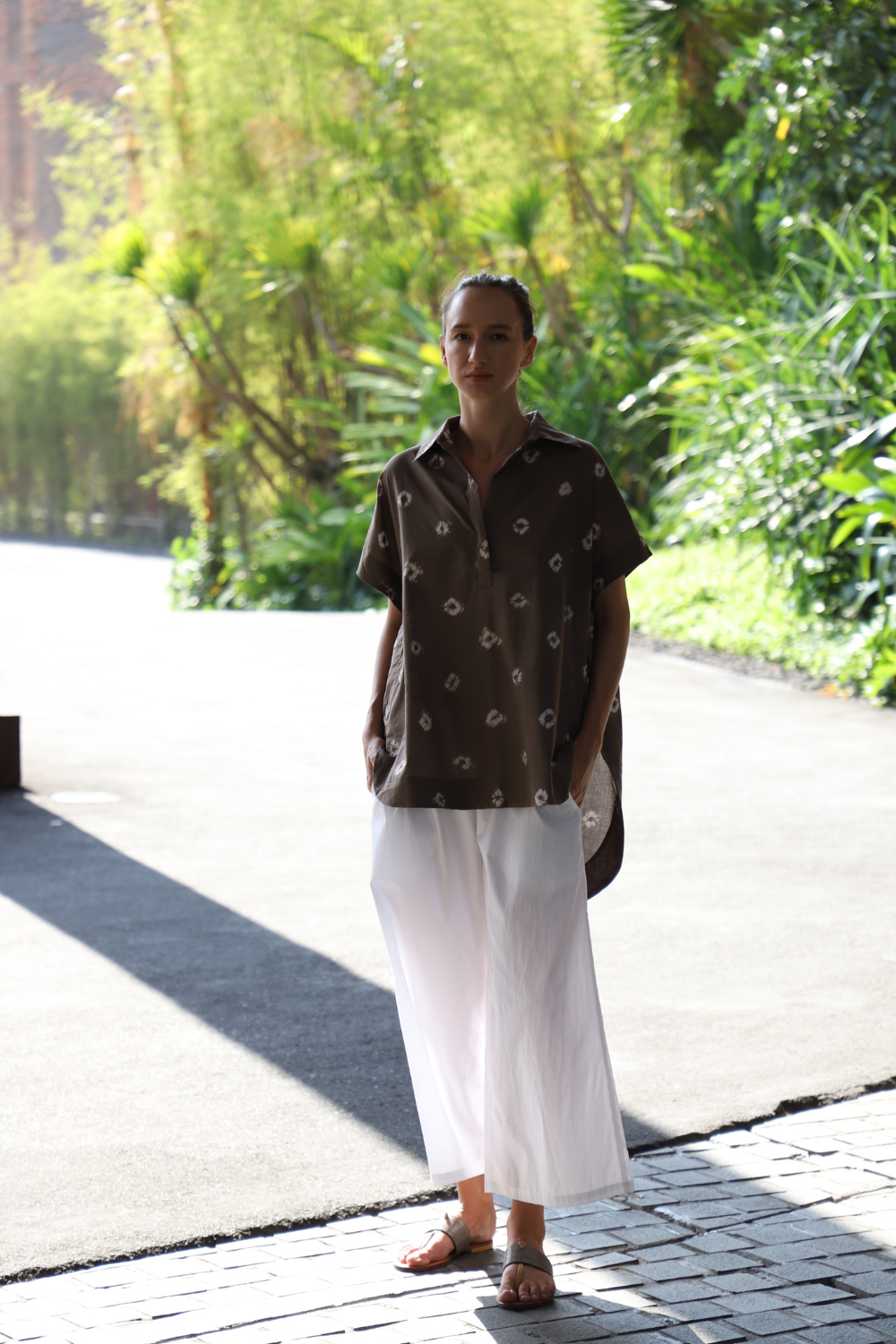 The Clara Top, in cotton voile, features a polo neck and a fluid silouhette, wear it bare legs to go down to the beach or style it with trousers or skirt for a city look.