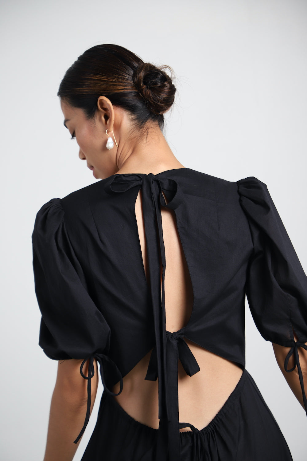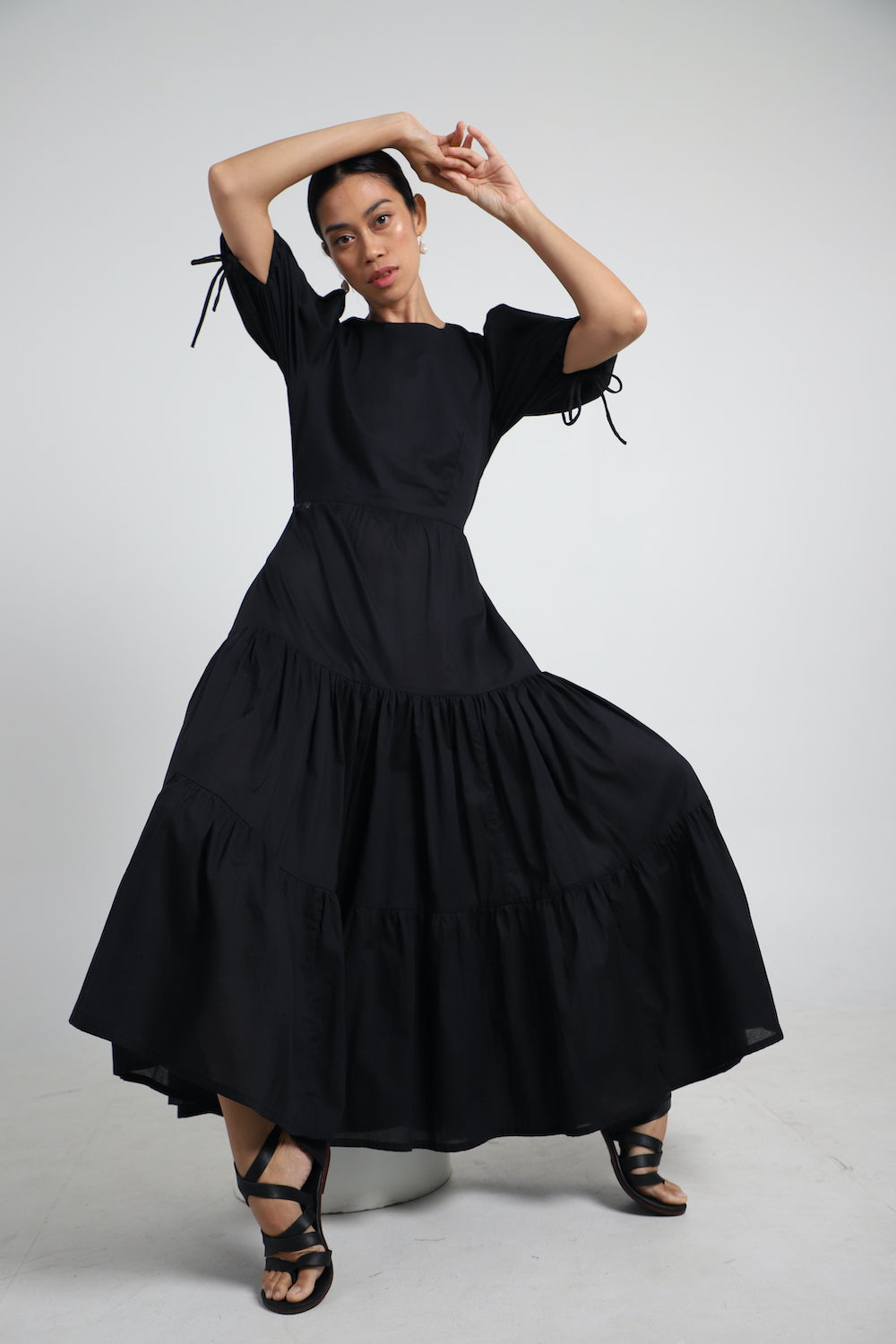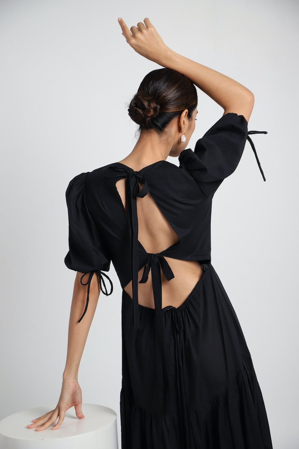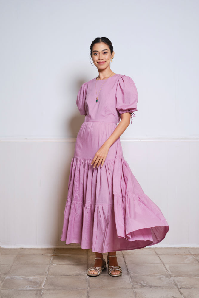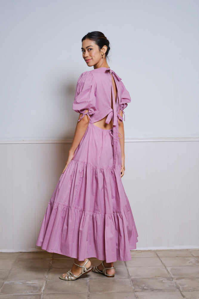 The Uma long dress, hand-crafted from soft cotton, is embellished with graceful bows on the back and has a romantic gathered, tiered maxi skirt.